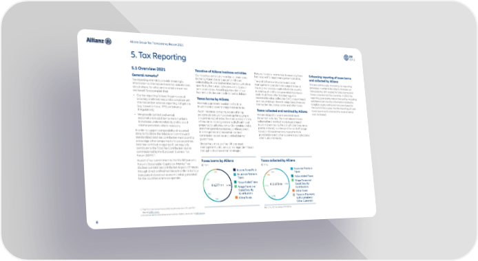 5. Tax Reporting 5.1 Overview 2021 General remarks # Tax reporting intends to provide meaningful information to internal and external stakeholders about where, for what and to what amount we are taxed. To accomplish that: • Our tax rep orting follows the principles of accuracy and timeliness and is compliant with internal and/or external reporting obligations (e.g. based on local, IFRS, or Solvency II regulations). • We pr ovide context and verbal explanations in addition to mere numbers to increase understandability and to avoid misinterpretations where necessary. Taxation of Allianz business activities Our total tax contribution can be split into taxes borne by Allianz (as a taxpayer) and taxes collected by Allianz and remitted to tax authorities specifically for our policyholders, employees or service providers. Accordingly, taxation of our business activities can be described as follows: Taxes borne by Allianz We mainly generate taxable profits from insurance and asset management activities. As an insurance company, we are offering policyholders insurance coverage for payment (i.e. premiums) whereby the most common forms of insurance coverage relate to life/health and property/casualty insurance. Our taxable profits stem from premiums received and investment income generated, less administration/ commission expenses and settled claims/ guarantees. Under the umbrella of our Allianz asset management units, we also manage client funds through active investment strategies. Here, our taxable income results especially from fees received for asset management activities. The profits from our insurance and asset management operations are subject to tax at the income tax rates applicable in the country in which such profits are generated. Additional costs result from other taxation e.g. non- recoverable value added tax (VAT) on purchased services, employer share in wage taxes, financial transaction tax, stamp duties and other taxes. Taxes collected and remitted by Allianz We are obliged to collect and remit taxes for certain activities. The most relevant taxes collected and remitted relate to purchased insurance services by the policyholder (insurance premium taxes), salaries paid to our staff (wage taxes) and investment return payments to policyholders and other customers (policyholders/ other customer taxes). Enhancing reporting of taxes borne and collected by Allianz We are continuously improving our reporting processes in order to be able to increase our transparency with respect to taxes borne and taxes collected split by countries. In 2021 the reporting granularity was enhanced by including additional per country information related to tangible assets and current income taxes for the current fiscal year. For the reporting of cash taxes borne and collected the level of detail was increased. In order to support comparability of reported data, to facilitate the debate on common and standardized total tax contribution metrics and to encourage other companies to follow a common total tax contribution approach, we regularly contribute to the Total Tax Contribution studies commissioned by the European Business T ax Forum (EBTF) 11 . As part of our commitment to the World Economic Forum’s Stakeholder Capitalism Metrics 12 we disclose our total tax contribution to public finances through direct and indirect taxes in order to be fully transparent about our economic value generated for the countries where we operate. 11 Total-Tax-Contribution-A-st udy-of-the-largest-compa nies -in-Europe-2021- Repor t (ebtforum.org). 12 For further details on the Stakeholder Capitalism Metri cs, pl ease see the WEF web site. GRI 207–3 Value Added Taxes Insurance Premium Taxes Taxes on Payments to Policyholders/ Other Customers Wage Taxes and Social Security Contributions Other Taxes € 11,670 mn 5,958 1,270 446 2,916 1,080 Taxes collected by Allianz € mn Income Taxes Paid Value Added Taxes Insurance Premium Taxes Wage Taxes and Social Security Contributions Other Taxes € 6,277 mn 3,050 464 951 1,607 205 Taxes borne by Allianz € mn Total amount of recoverable VAT € 895 mn Allianz Group Tax Transparency Report 2021 6